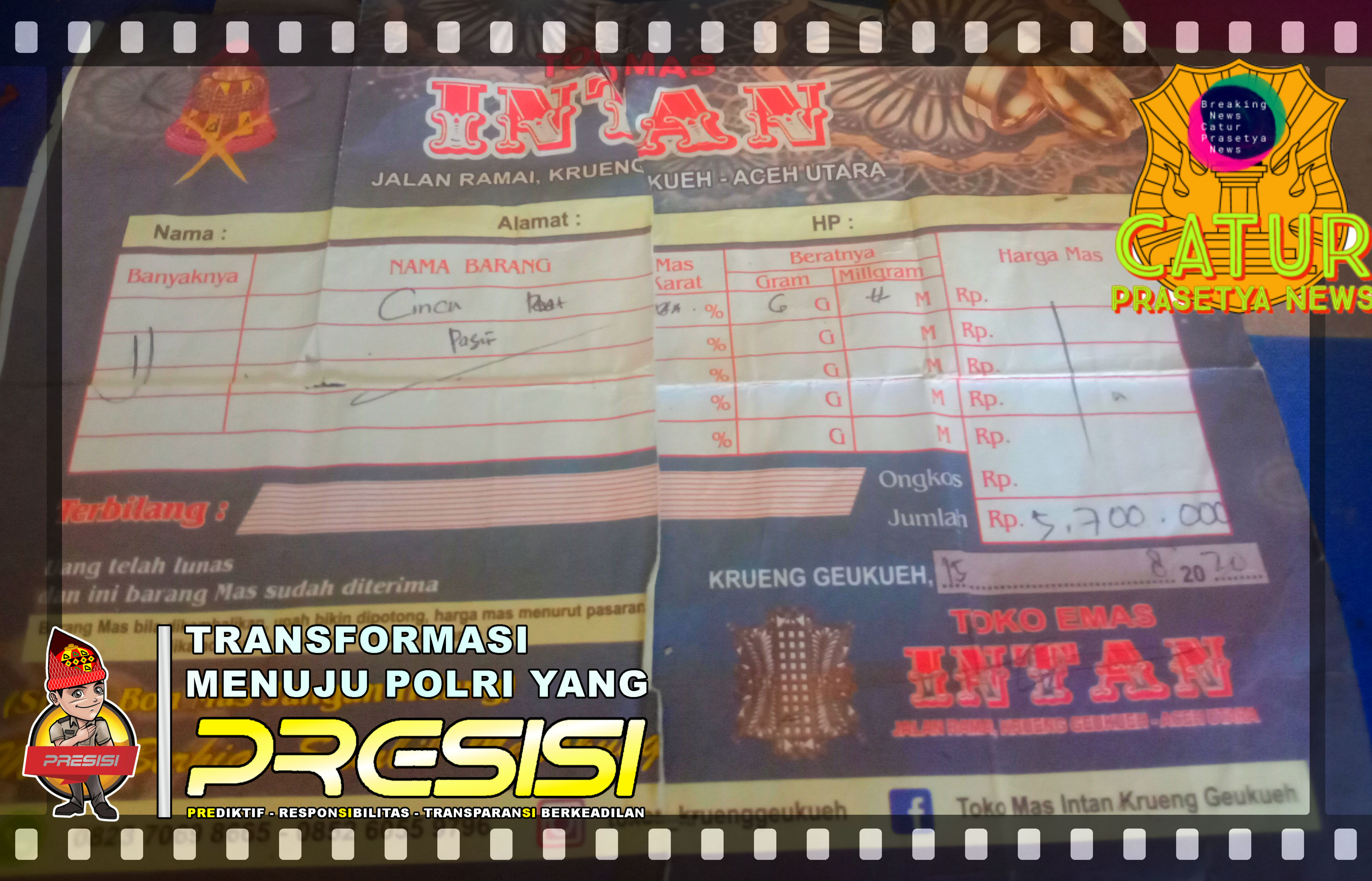 Kruenggeukeuh/ACEH UTARA- Catur Prasetya News Seorang Ibu Rumah Tangga Beriniansial S Membeli emas 99 Mas Karat dengan berat 6 Gram dengan Harga Rp. 5.700.000,00 yang dibeli di Toko Mas Intan Jalan Ramai Kruenggeukeuh Aceh Utara pada 15 Agustus 2020.