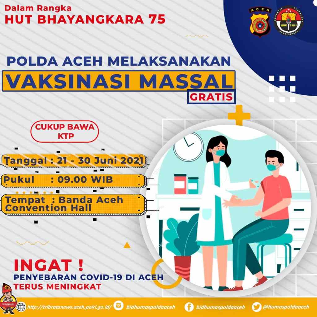 Selain itu, Winardy menambahkan , Kepolisian Daerah Aceh juga melaksanakan vaksinasi massal secara gratis kepada masyarakat yang akan digelar sejak tanggal 21 – 30 Juni 2021 di Gedung Conveention Hall, kota Banda Aceh.