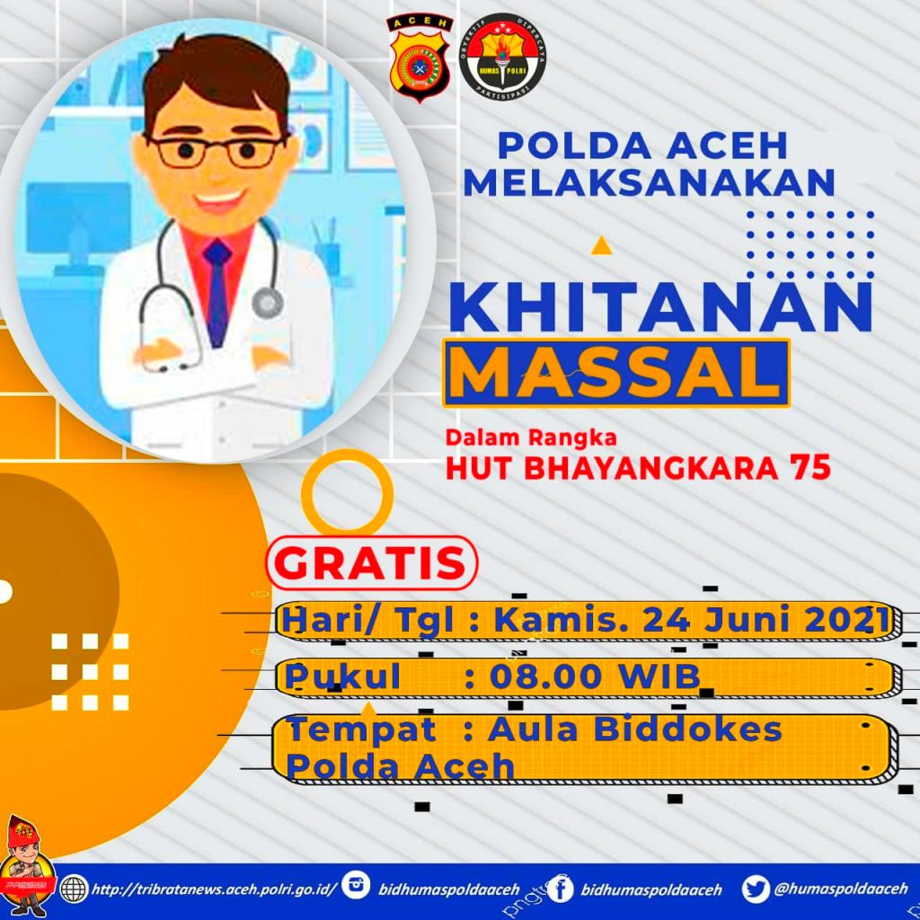 Banda Aceh – Catur Prasetya News.com Markas Besar Kepolisian Daerah (Polda) Aceh melaksanakan Khitanan Massal yang akan dilaksanakan di Aula Biddokes, Lamteumen, kota Banda Aceh, pada hari Kamis tanggal 24 Juni 2021.