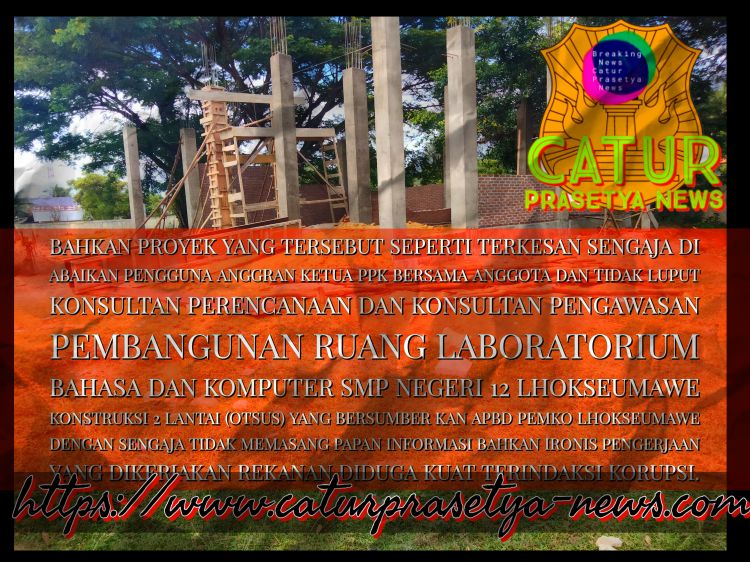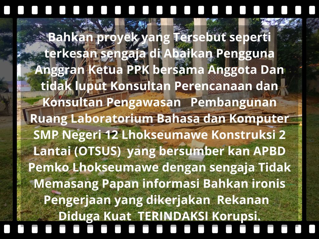 Pengguna Anggaran Adalah Dinas Pendidikan Kota Lhokseumawe khusus Ketua PPK dan Anggota PPK termasuk Pengguna Anggaran Yang patut Dinilai Kinerja nya tidak Optimal Bahkan proyek yang Tersebut seperti terkesan sengaja di Abaikan Pengguna Anggran Ketua PPK bersama Anggota Dan tidak luput Konsultan Perencanaan dan Konsultan Pengawasan Pembangunan Ruang Laboratorium Bahasa dan Komputer SMP Negeri 12 Lhokseumawe Konstruksi 2 Lantai (OTSUS) yang bersumber kan APBD Pemko Lhokseumawe dengan sengaja Tidak Memasang Papan informasi Bahkan ironis Pengerjaan yang dikerjakan Rekanan Diduga Kuat TERINDAKSI Korupsi.