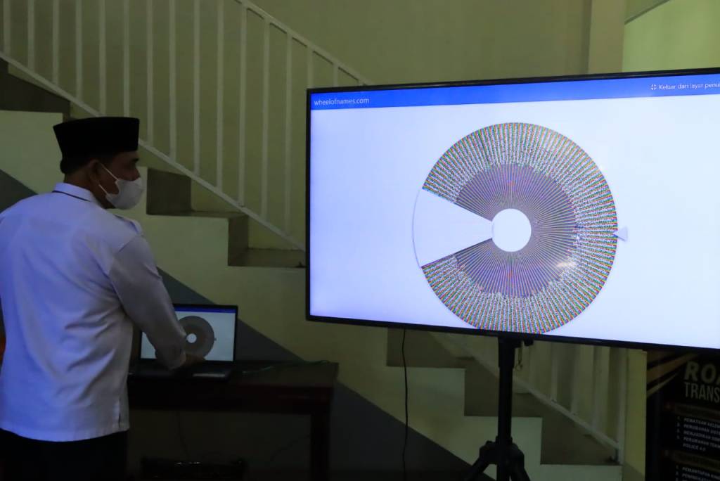 Pada Paket Umuroh tahap III kali ini Sebut Kapolres, khusus bagi masyarakat diberikan kewenangan utk mengundi Sendiri Siapa yg berhak utk mendapatkan 1 paket Umroh , sehingga hari ini kita laksanakan Pengundian dengan menggunakan Aplikasi Wheel of Names.