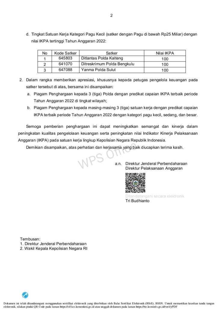 Kementerian Keuangan Republik Indonesia berdasarkan Surat yang ditandatangani Direktur Direktorat Jenderal Perbendaharaan Direktur Pelaksanaan Anggaran Tri Budhianto, hal ini tertuang dalam Surat KEMENKEU DJPN Surat Nomor : S-7/PB/PB.2/2023 Prihal Penyampaian Data dan Penghargaan atas Nilai Indikator Kinerja Pelaksanaan