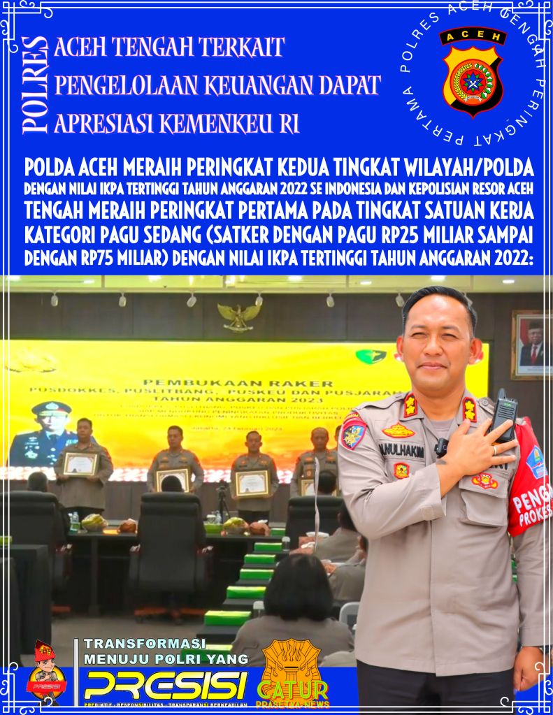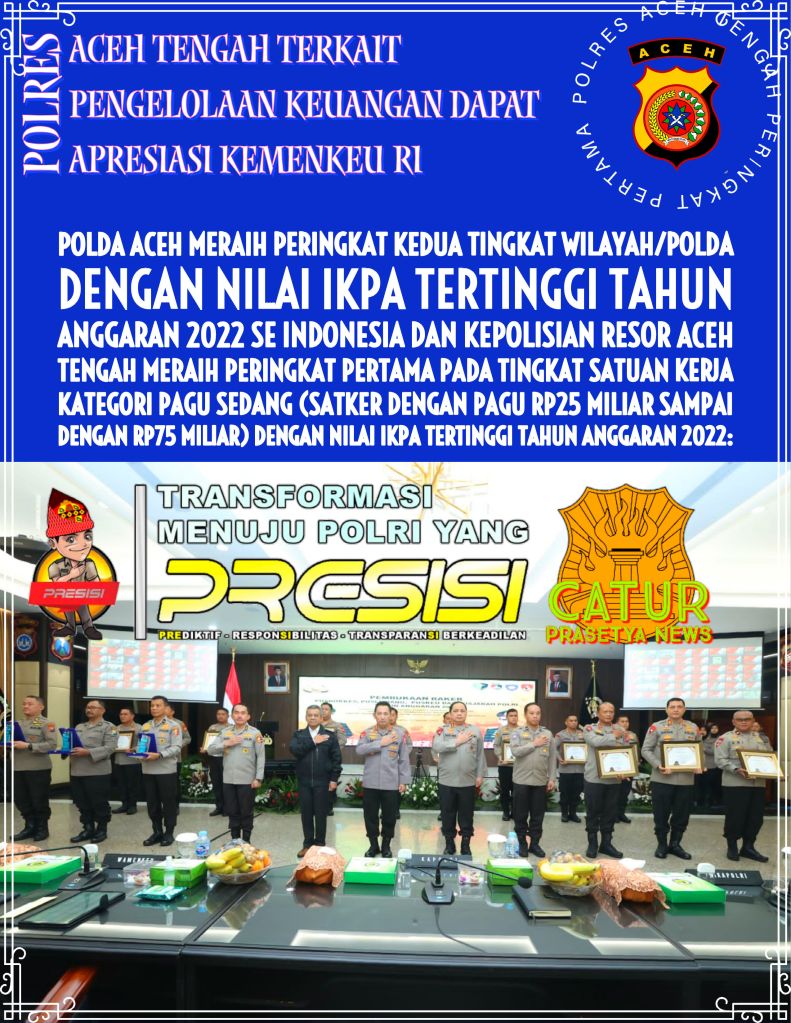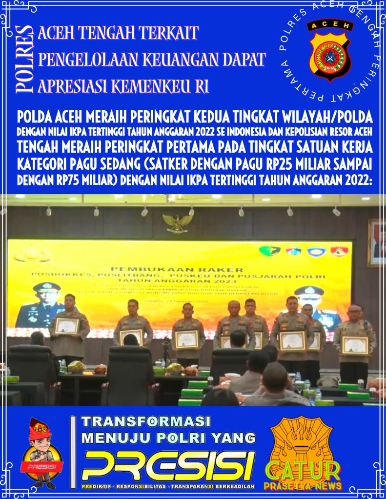 Jakarta | Catur Prasetya News – sebuah Kebanggaan Bagi Kepolisian Daerah Aceh terhadap Kinerja pengelolaan keuangan negara oleh Polres Aceh Tengah layak dicontoh satuan kerja lainnya. Hal ini menjadi apresiasi oleh Kementerian Keuangan (Kemenkeu) Direktorat Jenderal Perbendaharaan Negara (DJPN) yang bermarkas diGedung Prijadi Praptosuhardjo I Lantai 2, Jalan Lapangan Banteng Timur No. 2-4, Jakarta Pusat 10710.