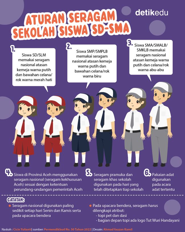 Aturan seragam sekolah ini berlaku bagi siswa mulai dari Sekolah Dasar (SD) hingga Sekolah Menengah Atas (SMA).