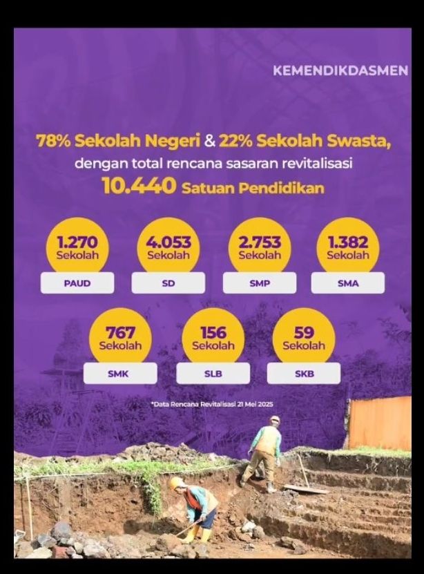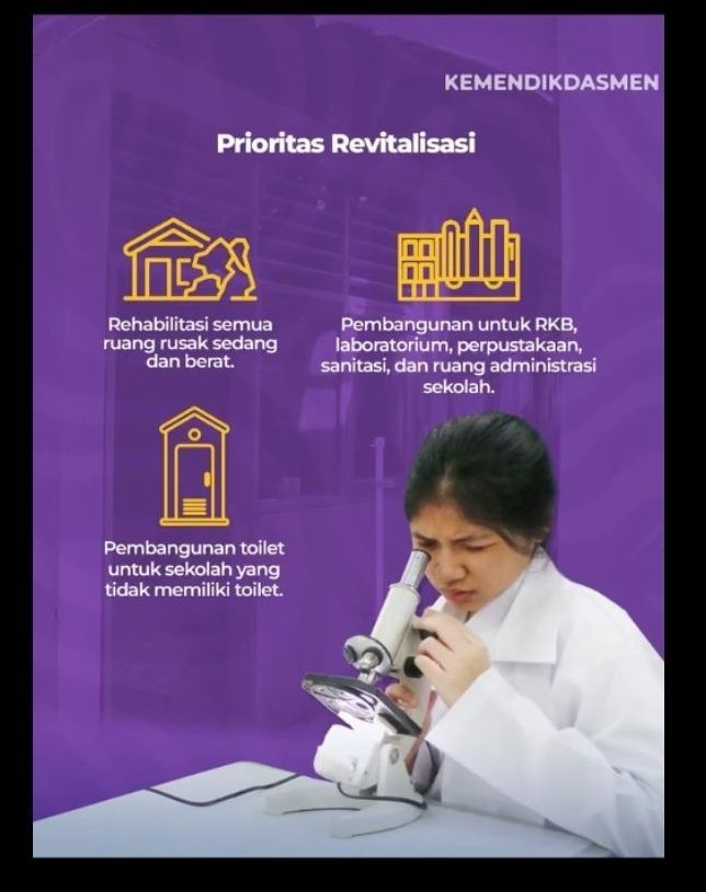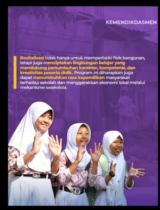 Revitalisasi tidak hanya untuk memperbaiki fisik bangunan, tetapi juga menciptakan lingkungan belajar yang mendukung pertumbuhan karakter, kompetensi, dan kreativitas peserta didik. Program ini diharapkan juga dapat menumbuhkan rasa kepemilikan masyarakat terhadap sekolah dan menggerakkan ekonomi lokal melalui mekanisme swakelola.